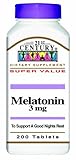 Melatonin is a hormone produced from the pineal gland which is nested at the center of the brain. Melatonin production declines as we age, from a 50% loss in production at age 45 to a slow trickly at age 80. This decline in Melatonin production is considered a major cause for insomnia. Sound sleeping habits promote healthy, happier and longer life spans.* Melatonin works in harmony with your natural sleep cycle to promote relaxation and sleep so you can wake up refreshed and revitalized.* Unconditionally guaranteed for purity, freshness and label potency. No added Sugar, Yeast, Preservatives, Artificial Flavors or Colors. 21st Century Vitamins and Supplements are manufactured in a cGMP facility under the strictest standards for product quality, including potency and purity. 21st Century prides itself on providing you with a great product at the best value. *This statement has not been evaluated by the Food and Drug Administration. This product is not intended to diagnose, treat, cure, or prevent any disease.